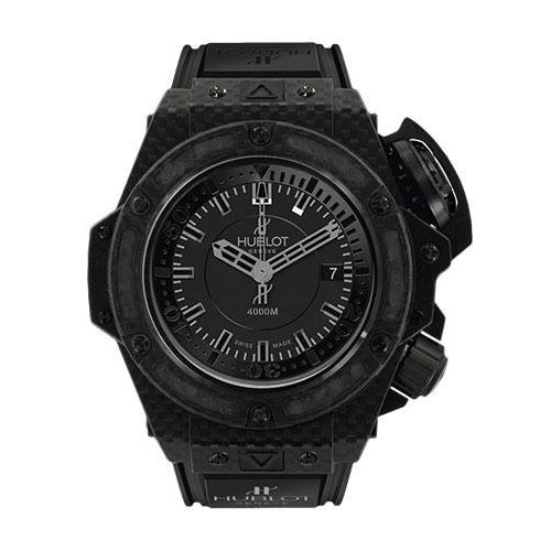 48mm carbon fiber case, carbon fiber bezel, mat black dial, self winding HUB 1400 movement, approximately 42 hours of power reserve, black rubber strap with deployant buckle. Water resistant to 4000 meters.