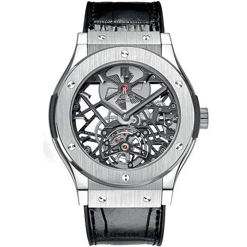 45mm titanium case, sapphire crystal back, titanium bezel, black composite resin lateral inserts and bezel lugs, sapphire dial, manual winding MHUB 6010.H1.1 movement with skeleton tourbillon, approximately 120 hours of power reserve, black rubber and alligator strap with deployant buckle. Water resistant to 50 meters.