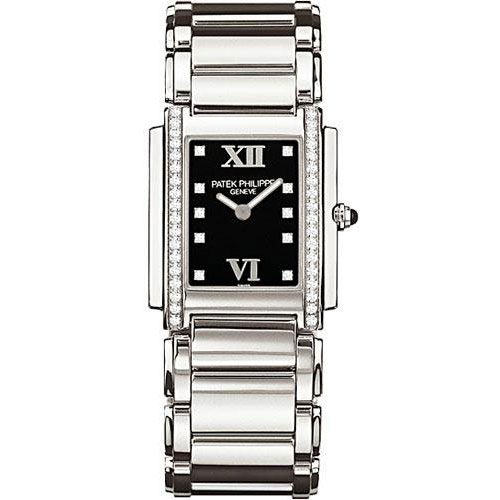 25mm x 30mm stainless steel case set with diamonds, black dial, quartz caliber E 15 movement, stainless steel bracelet. Water resistant to 30 meters.